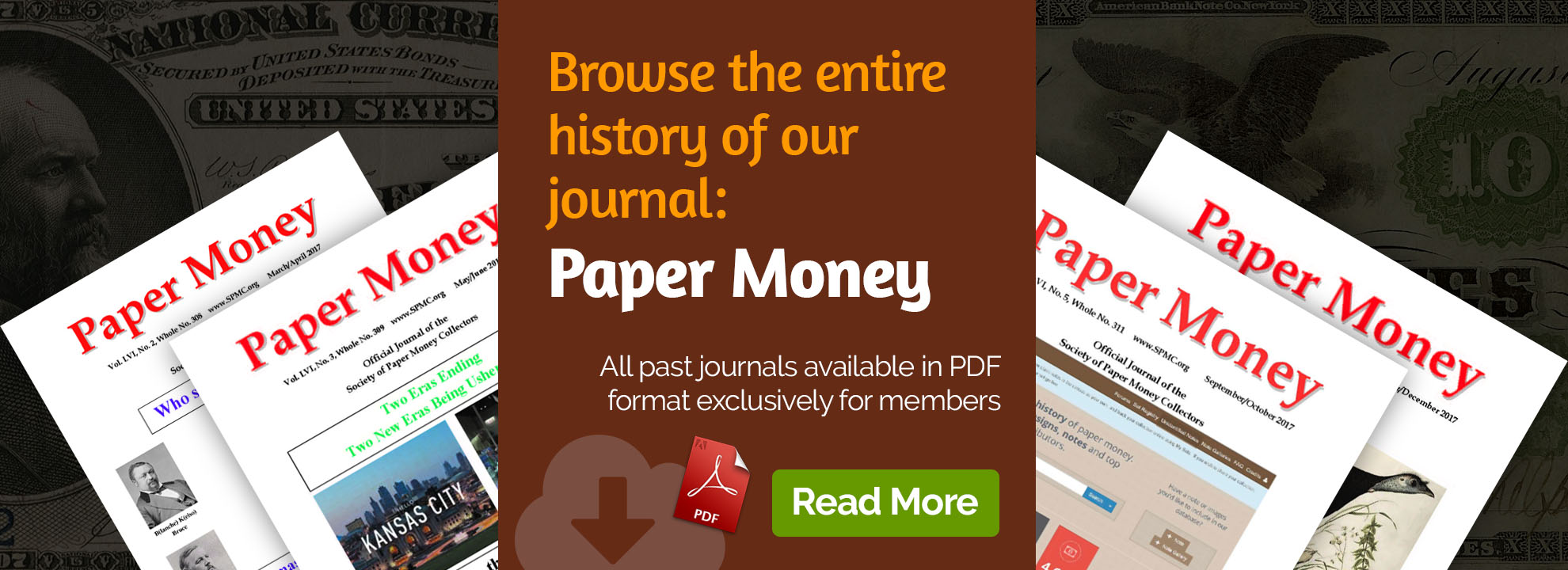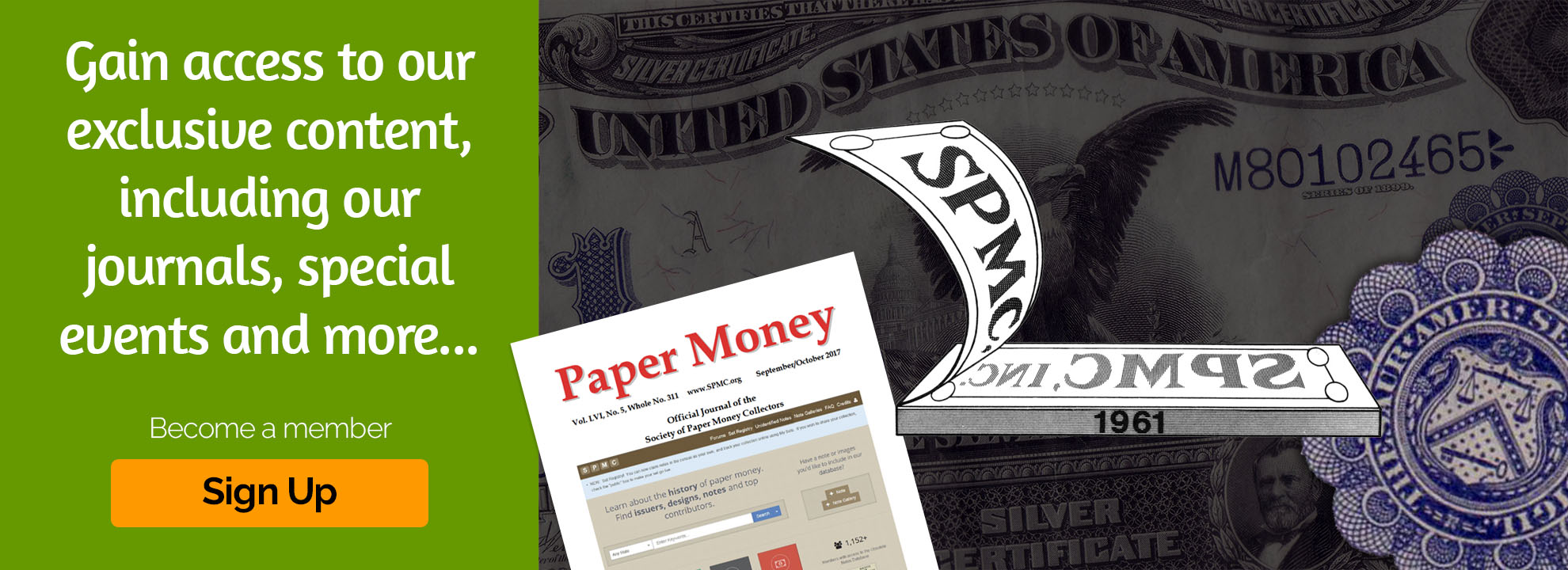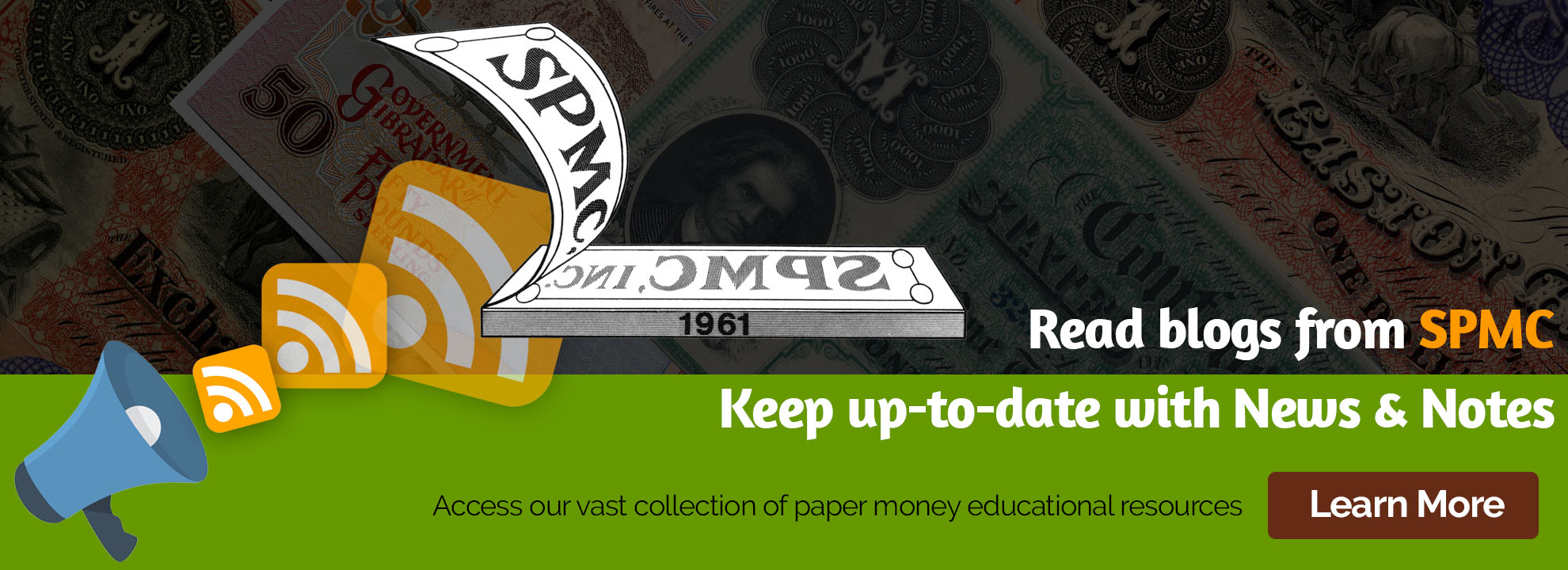 The Society of Paper Money Collectors (SPMC) promotes the study and appreciation of paper money and related financial history. As a non-profit organization, the SPMC provides grants for research, publishes a bi-monthly journal, sponsors exhibits and lectures at regional and national venues, and supports education and outreach to the greater numismatic community.