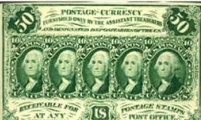 If you have been reading BNR and the recently issue of Paper Money, you will see that Fred Reed had done a wonderful job of outlining how postage and then fractional currency came into being, the laws, the players, etc. But when did it actually first begin circulating? A law was signed into service on July 17, 1862 that began postage currency. The notes were first issued on August 21, 1862 and lasted until May 29, 1863. The first notes were printed entirely by the National Banknote Company (which was printing the postage stamps of the day) and came in sheets that had to be cut apart by hand. It was decided to print them with perforations like postage stamps. Soon after printing of the sheets began, as a security measure, Secretary of the Treasury Chase directed that the National Banknote Company print the fronts and the American Banknote Company print the backs of the notes. These notes come with a small ABC in the lower right corner of the back and are perforated as well. However, these perforations were found to be difficult and inconvenient for the public so the issue reverted to the plain edge sheets. The design of the issue has the 5-cent and 10-cent stamps of Washington and Jefferson as their central vignette. The twenty-five and fifty cent notes show five of the stamps. Five and ten-cent notes were issued in sheet of 20 (4 vertically by 5 horizontally) and the twenty-five and fifty cent notes were issued in sheet of 16 (4X4). When the notes became available to the public, there was a very high demand for them due to the small change crisis. Some cities had to limit the amount of the currency that merchants could buy due to this high demand. Due to counterfeiting, the second issue (first issue of fractional currency) was begun.