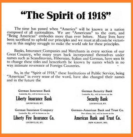 Four Louisville-area banks proclaimed their American-ness by expunging "German" from their names (Image source: The Courier-Journal, Louisville, KY, March 3, 1918).