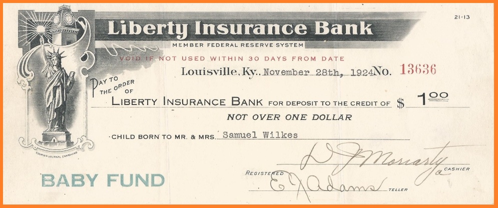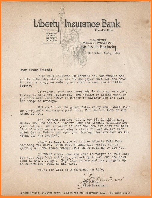 AT THE BEGINNING OF December 1924, John E. Huhn, Vice President of the Liberty Insurance Bank of Louisville, Kentucky, sent a solicitation letter under his signature to a three-week old newborn. The missive contained a greeting and a proposition. “Dear Young Friend”, the salutation began (for Huhn did not know the baby’s name) …... ”when we saw in the paper that you had come to town to stay, we made up our mind to send you a little letter ...… though you are just a wee little thing now, Mother and Dad and the Liberty Bank are already planning for your future. And in order to give you the earliest and best kind of start we are enclosing a check for one dollar with which Dad or Mother can open your Savings Account here at the ‘Bank for the People.’ “.