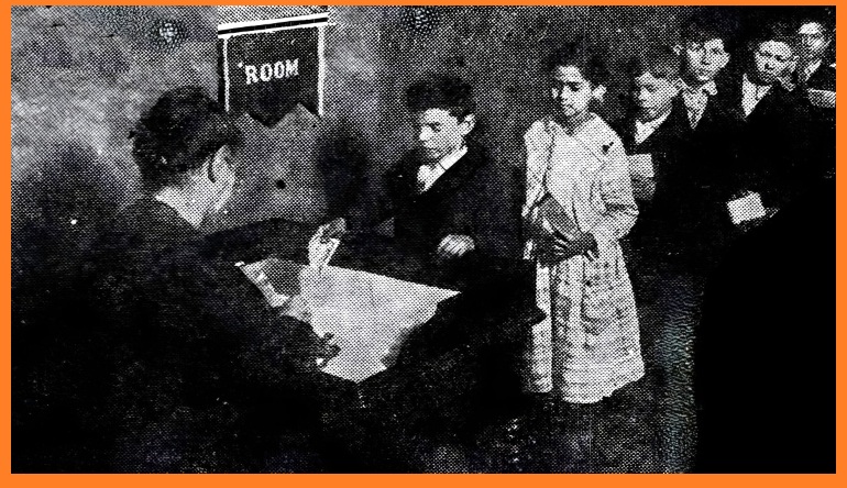 Students line up to make deposits to their school savings accounts on "bank day" at the Upper Fulton School in Louisville, Kentucky (Image source: The Courier-Journal, Louisville, KY, April 6, 1924).