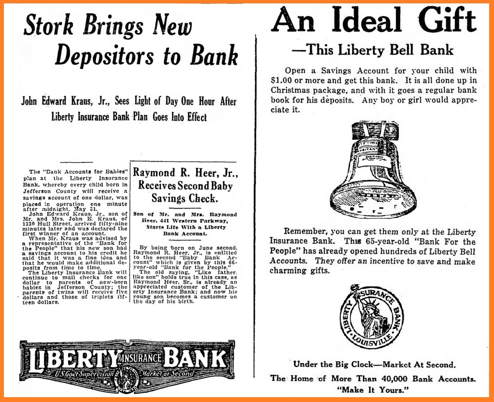 ABOVE: The solicitation letter, addressed to the Wilkes' newborn child, accompanying the $1.00 check. Starting in 1920, Liberty Insurance Bank sent similar offers to all children born in Jefferson County, Kentucky (Image source: author's collection). BELOW: Liberty Bank announces the first newborn customers under its Bank Accounts for Babies plan (L); the offer of Liberty Bell banks for children's deposits (R).