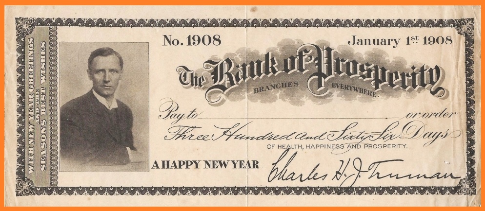 A New Year's novelty check, customized with the picture of Charles H. J. Truman. Note that it was made out for "Three Hundred and Sixty Six" Days, as 1908 was a leap year (Image source: Author's collection)