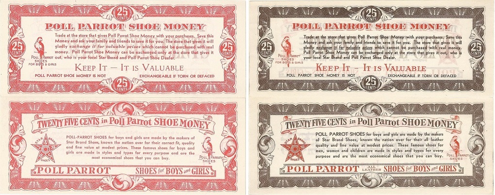 At the very least, Poll Parrot Shoe Money appears to have been issued in two varieties: one, entirely monochromatic by denomination (pictured above), the other in which the color scheme of each note is broken up by the use of red ink to print certain portions of the text. In this second variety, the star and parrot logos on both sides are printed in red, as are other phrases. In the case of the 25 ¢ denomination, which in the first variety was already entirely red, this second variety of that note is brown instead , with red printing. One other minor difference between the two varieties is the presence of the words “all leather” in the phrase “Poll Parrot All Leather Shoes for Boys and Girls” The monochromatic note variety lacks the words “all leather”. Which variety came first is unknown, though given the increasing use of synthetic materials in modern clothing, it is tempting to view the “all leather” version of Shoe Money as the earlier one.
