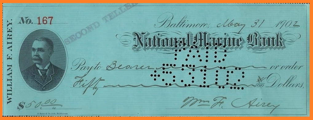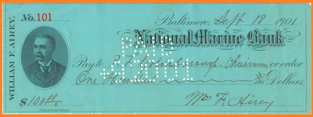 Thompson’s tribute to Airey appeared in a newspaper from August 1902. It is impossible to know for sure, but the check illustrated below, dated September 18, 1901 and made out to “P. L. Goldsborough, Chairman” may actually represent the very same payment mentioned in the passage above. In the light of Thompson’s remarks, Airey’s surviving checks appear not merely to be the private residues of a man’s personal finances but mark the very trail of his political career. Each one of these checks, featuring a portrait of the man and for the most part made out to “bearer” in some round dollar amount, served both as Airey’s calling card and a recorder of the particular monetary favor which Airey, the political operative, was dispensing for the occasion.